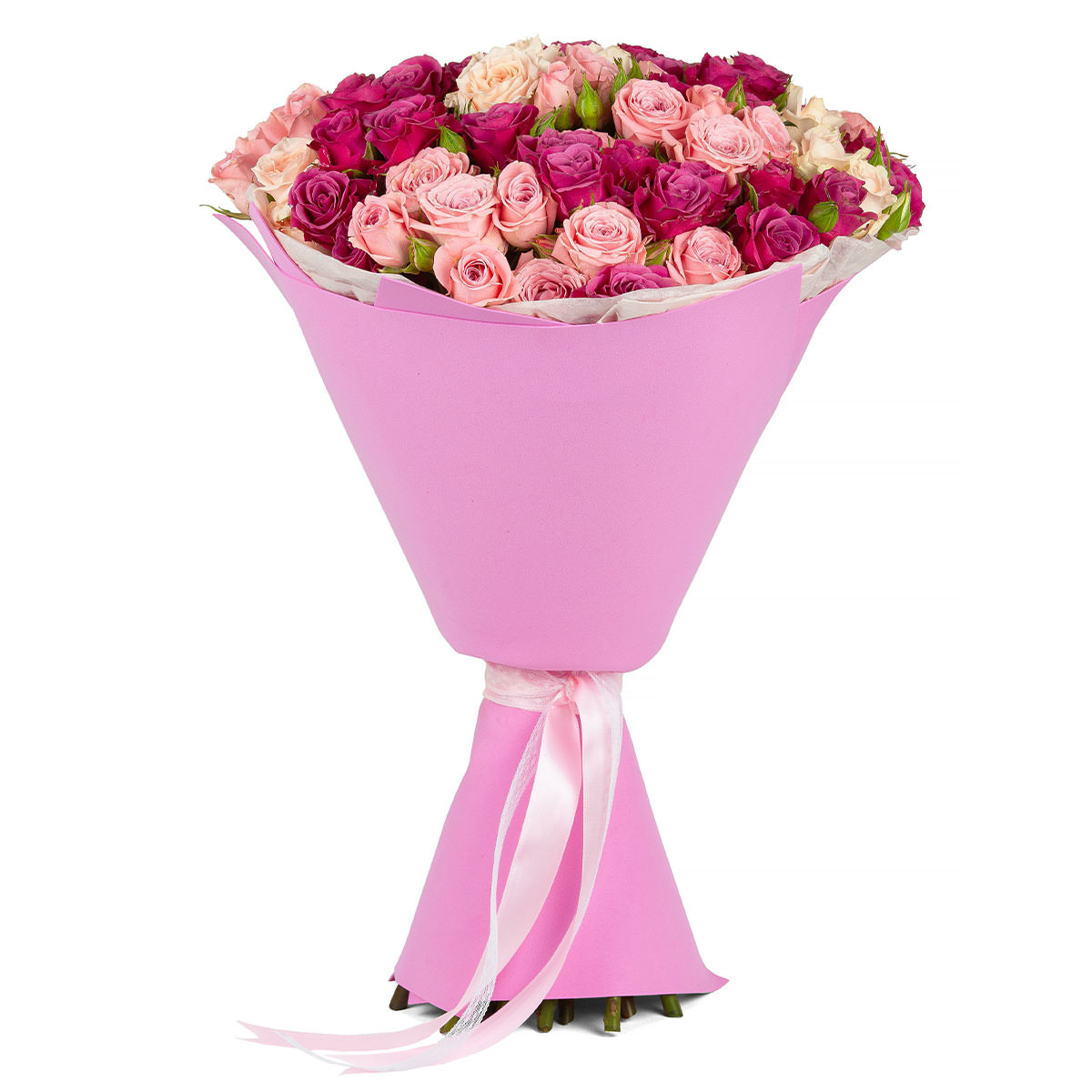 Роза кустовая розовая и сиреневая. Упаковка (лента, пленка, крафт, сетка, пленка матовая)