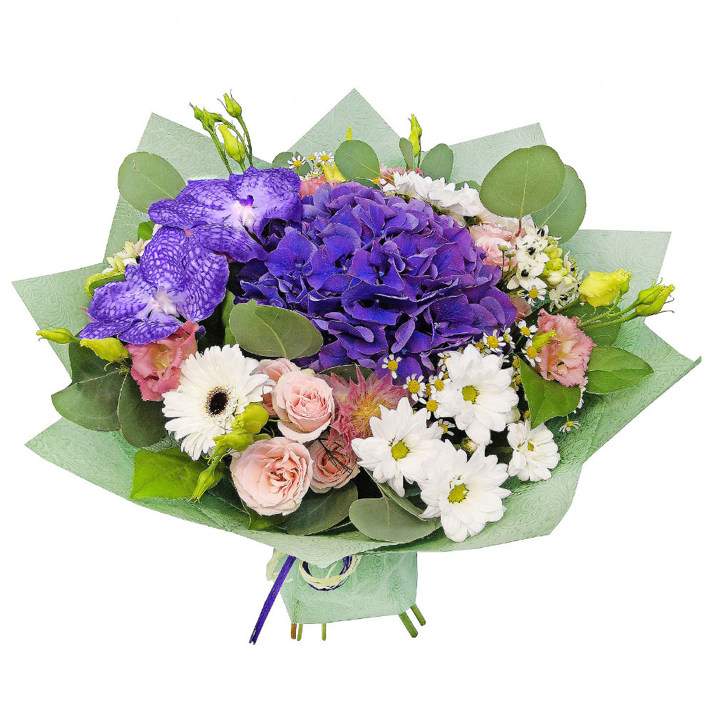 Гортензия фиолетовая, ванда, хризантема кустовая белая, гербера белая, роза кустовая розовая, эустома розовая, зелень. Упаковка (лента, пленка, крафт, сетка, пленка матовая)