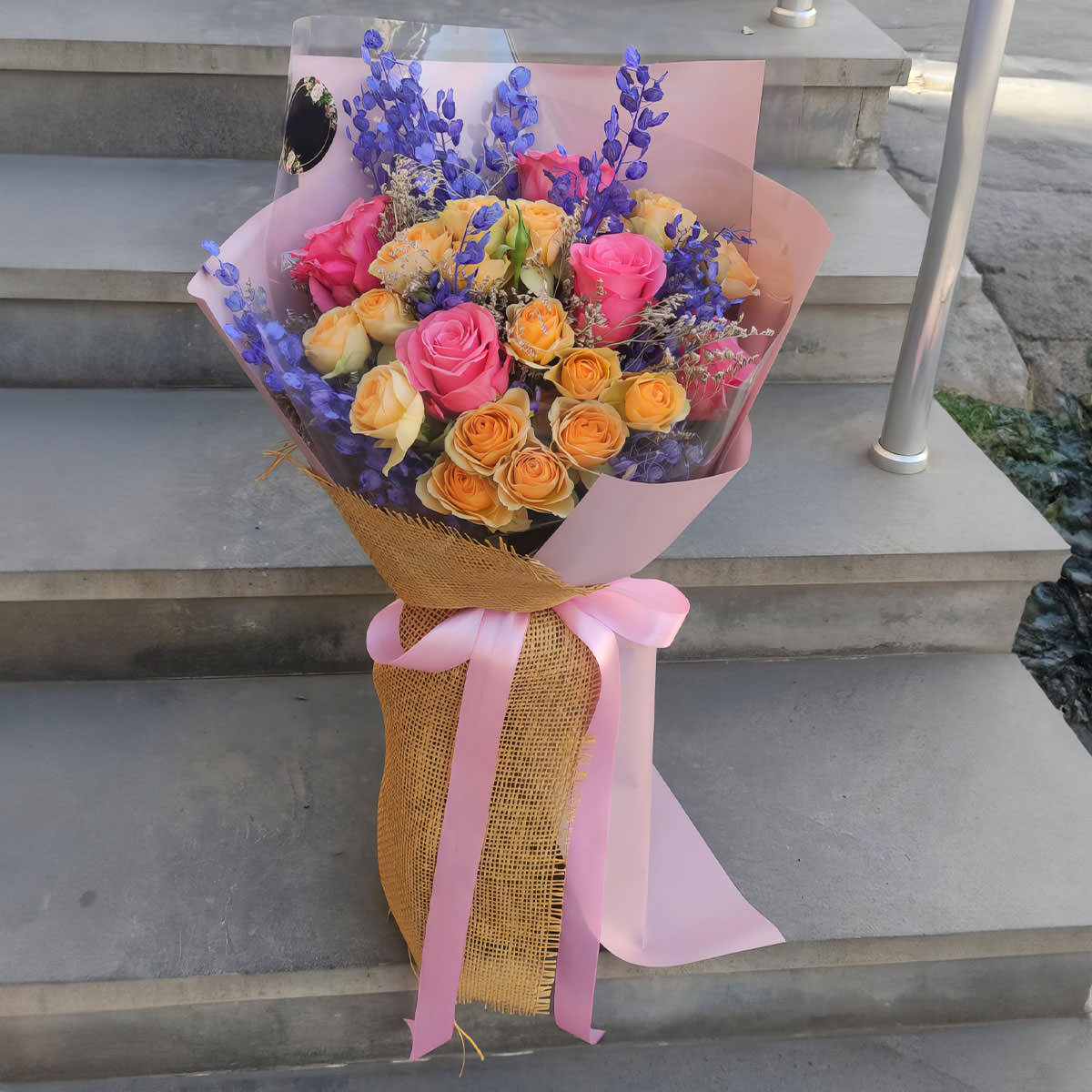 Роза одноголовая розовая, роза кустовая жёлтая, сухоцветы, лунария синяя. Упаковка (лента, пленка, крафт, сетка, пленка матовая)
