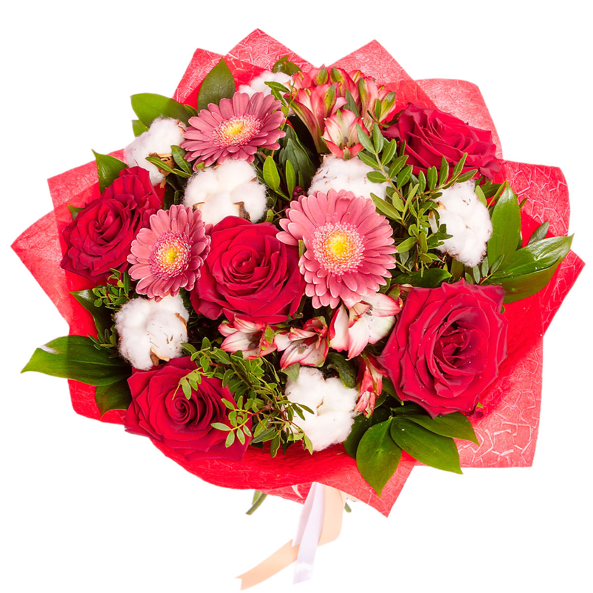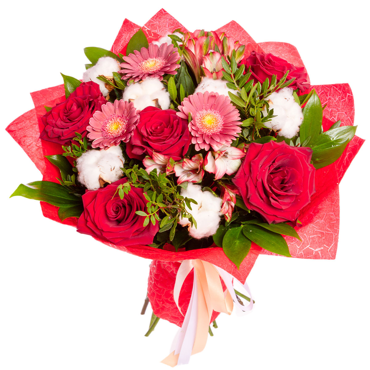 Роза одноголовая красная, гербера розовая, альстромерия розовая, хлопок, фисташка. Упаковка (лента, пленка, крафт, сетка, пленка матовая)