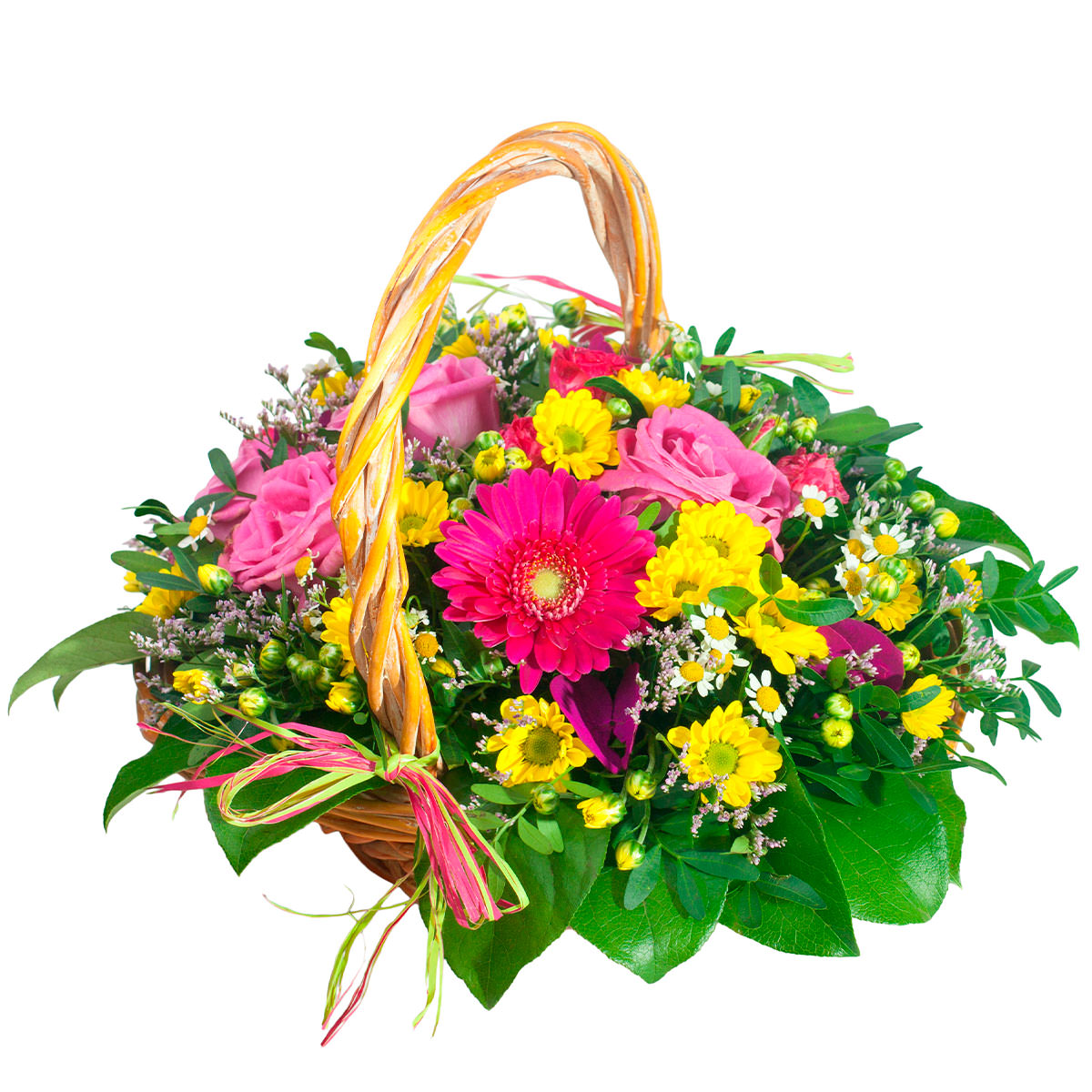 Гербера розовая, хризантема кустовая желтая, ромашка, лимониум. Упаковка (Корзина, оазис, ящик).