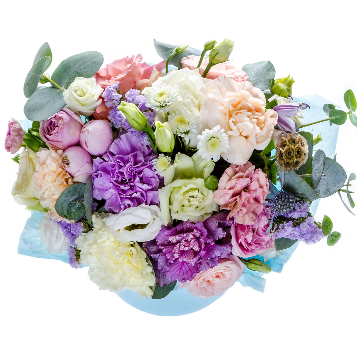 Гвоздика белая и сиреневая, роза пионовидная розовая, эустома белая, статица сиреневая, скабиоза сухоцвет, эрингиум, декоративная капуста, эвкалипт. Упаковка (шляпная коробка, квадратный бокс, коробка сердце, оазис)